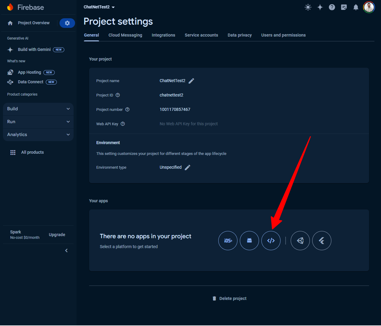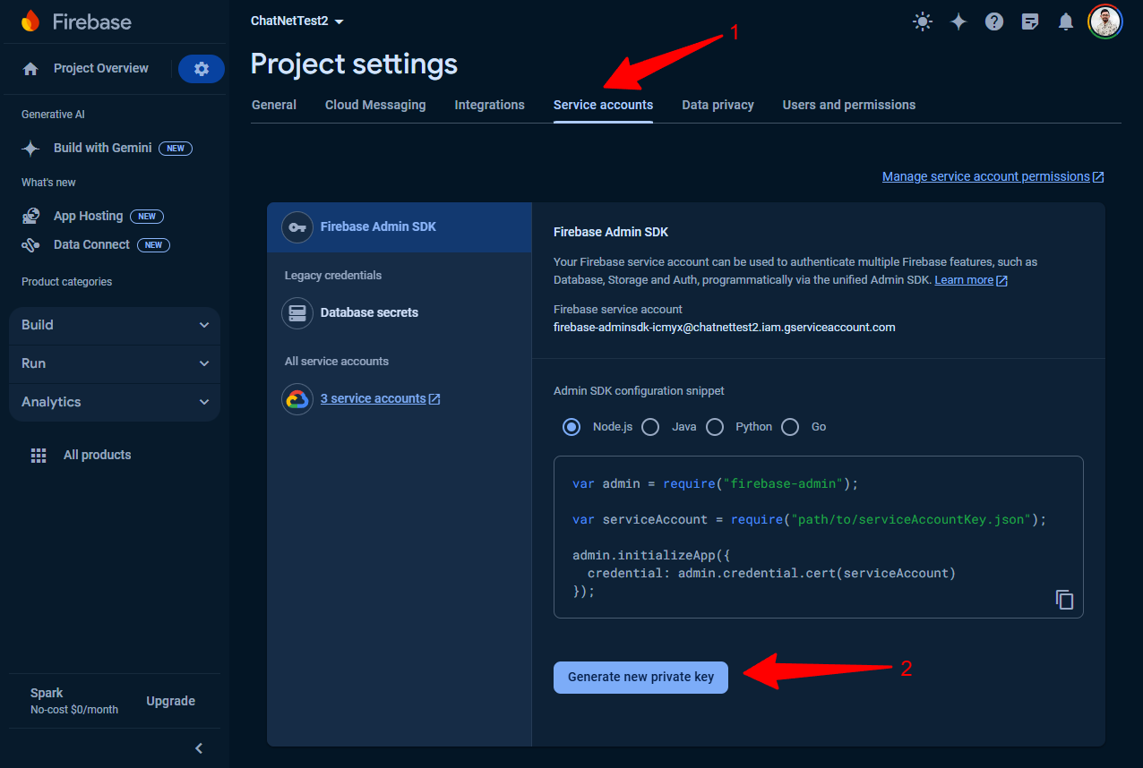 To enable push notifications in ChatNet, you need to provide several Firebase credentials. Follow these steps to obtain the required information: